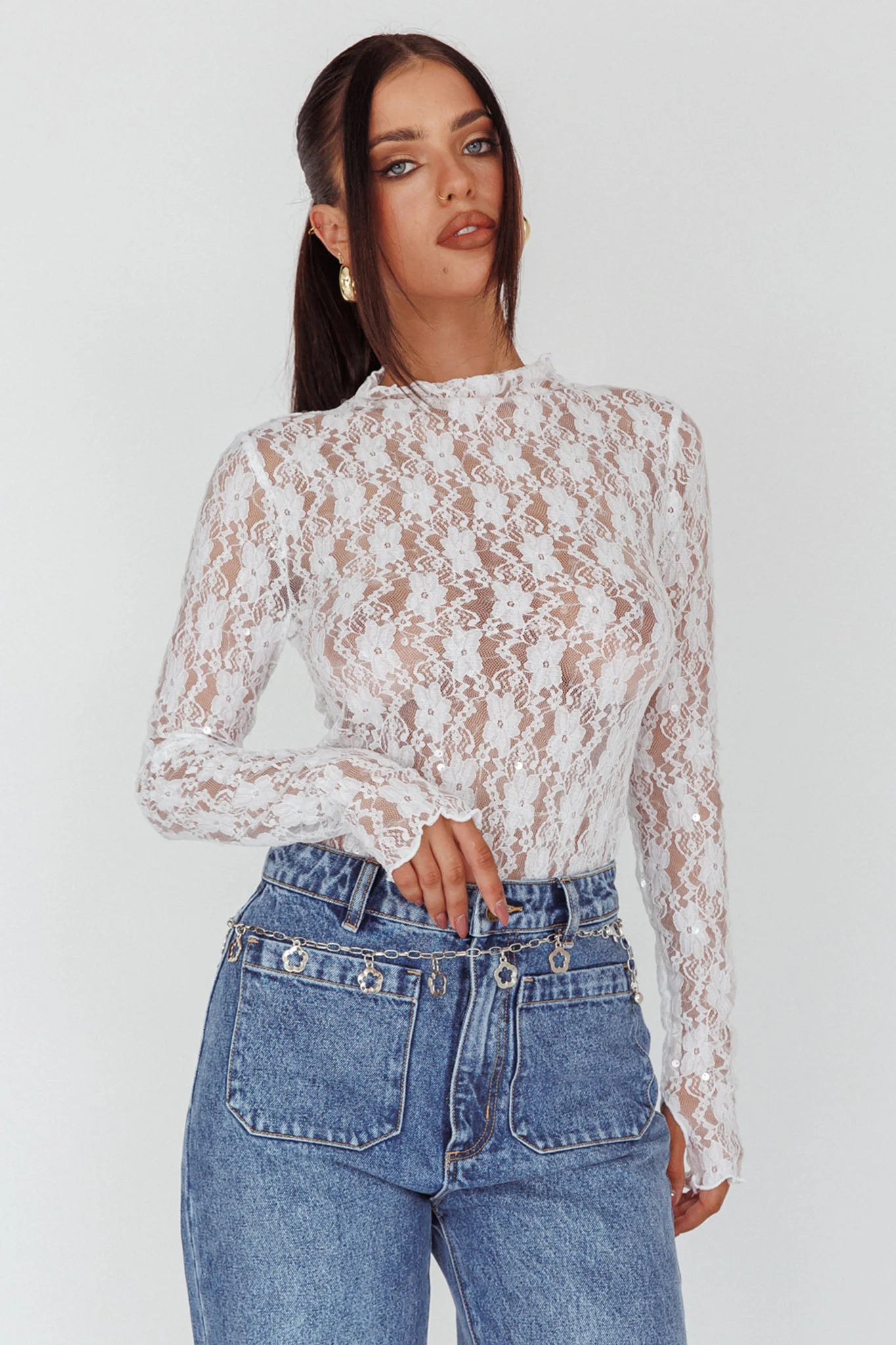 Turn heads in our chic Angel Baby top. We are in love with the sequin embellishment and pretty lace fabric. Perfect for a night out with your girls. Team it with denim jeans and mules for a look we are loving.