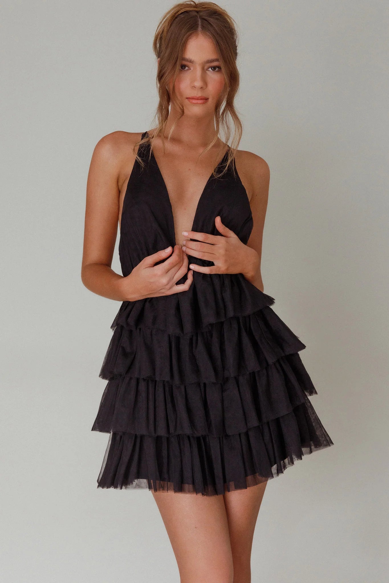 You will steal the show in our gorgeous Auguste mini dress. Featuring a plunging neckline and tiered frill bodice. Wear it on a girls' night out or for a special birthday celebration. Team it with black heels and a clutch for a look that'll have you flooded with compliments.