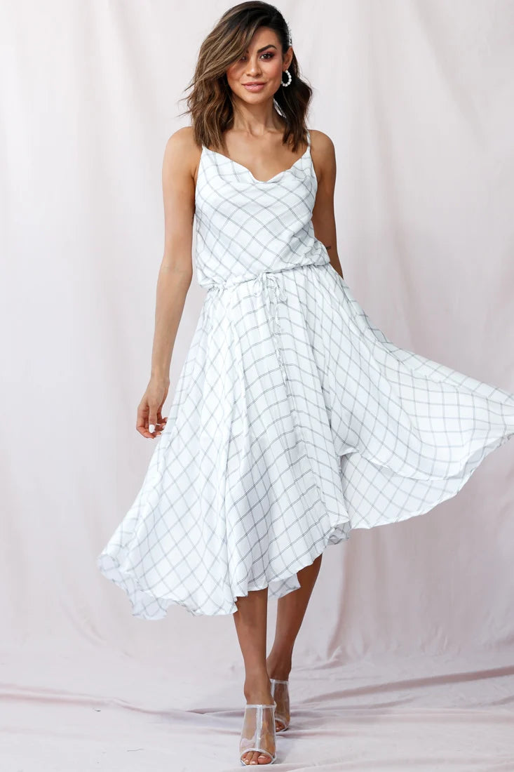 Hey pretty lady, you're looking good in our floaty Ava dress. Perfect for coffee with your bff's or a romantic dinner date. Featuring an on-trend cowl neck, adjustable cami straps and an adjustable drawstring waist. Team it with a nude heel and stacked gold bangles for a look we are loving.