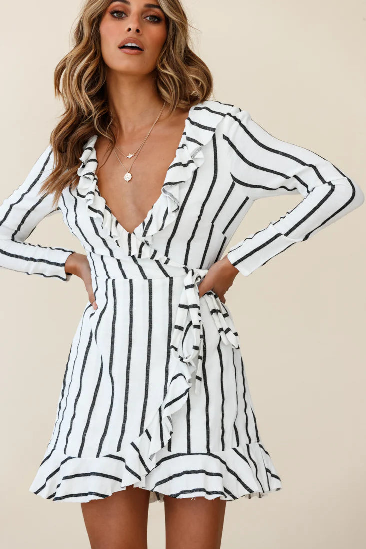 You're the picture of style and grace in our classy Beatrice dress. Featuring a ruffle trim with raw edge feature and a pretty open back. Perfect for Sunday Brunches with your girls or a dressy work event. Team it with tan mules and a tote to complete the look.
