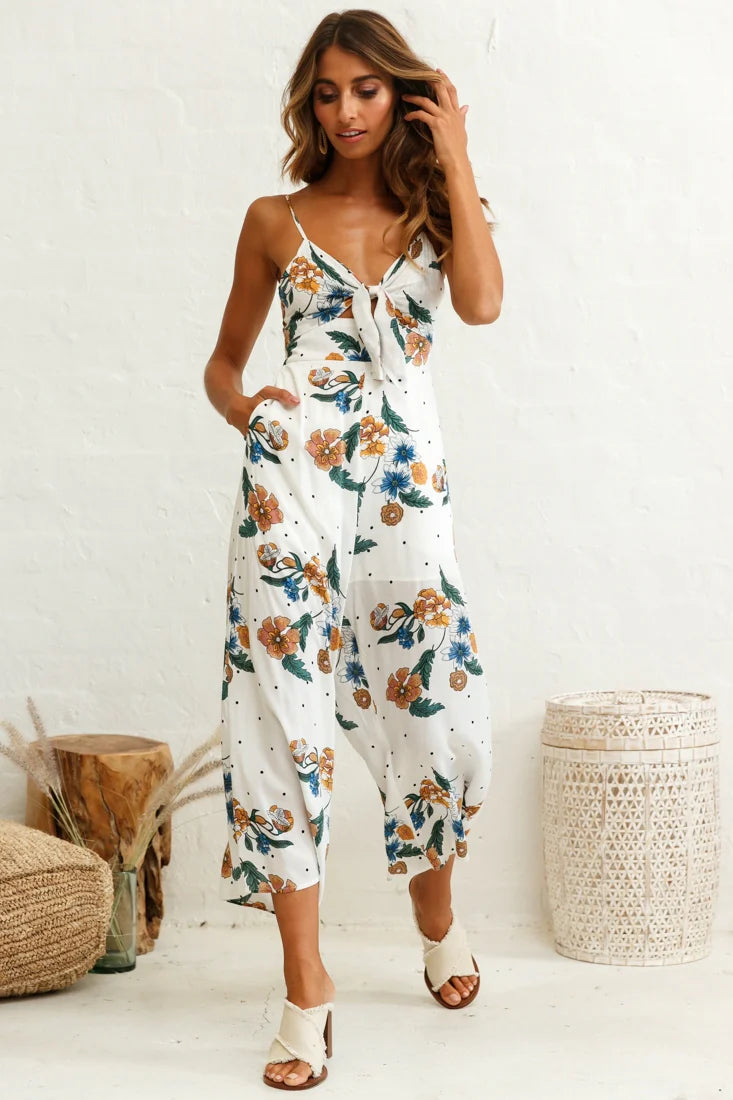 Make a statement in this classy capri-length jumpsuit. We love how easily it can go from office chic to happy hour with your girls after work. Featuring a beautiful floral print fabric throughout, tied bust, partial lining, zipper closure and bang-on-trend wide-leg pant with pockets... yes, you read that correctly, IT HAS POCKETS! Wear it with pointed toe flats for work and switch to some strappy nude heels and a statement necklace for after hours. You got it, girl!
