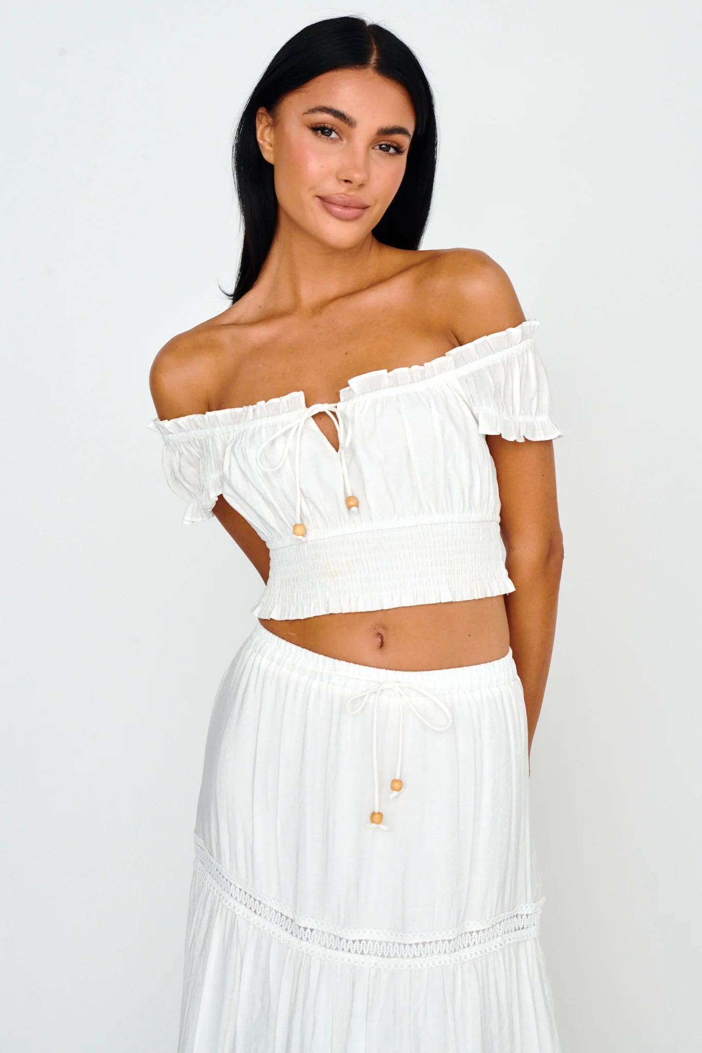 Float on by in our pretty Canyon Cove crop top. Featuring shirring in the waist and puff sleeves, it's perfect for Sunday brunch with your besties. Team it with its matching maxi skirt and sandals for a breezy, boho look we are loving.