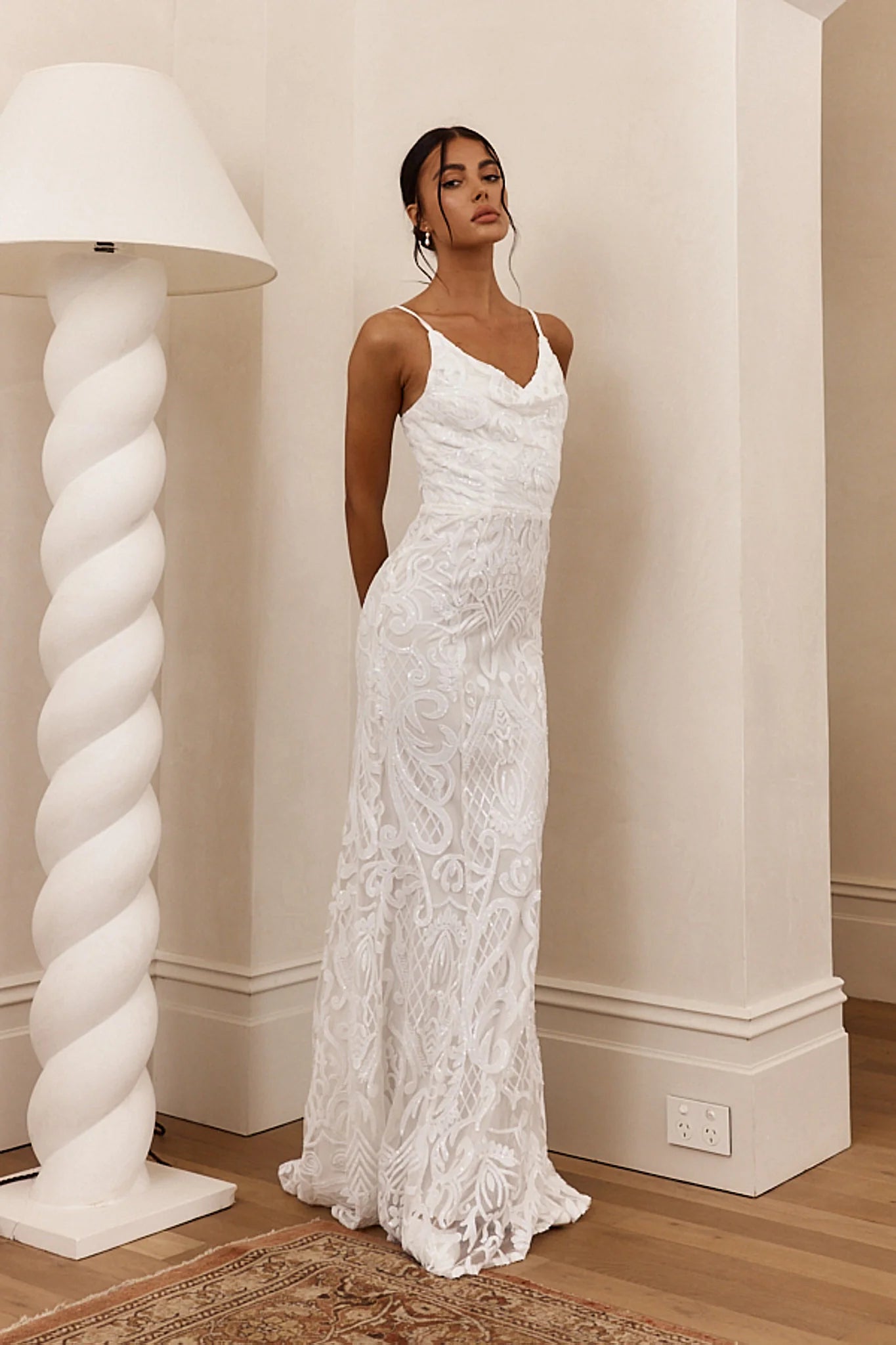 We are head over heels for our breathtaking Cezanne maxi dress. We are in love with the sequin detailing throughout and subtle cowl neckline. Perfect for a modern bride teamed with satin pumps and a bun for a fairytale look.