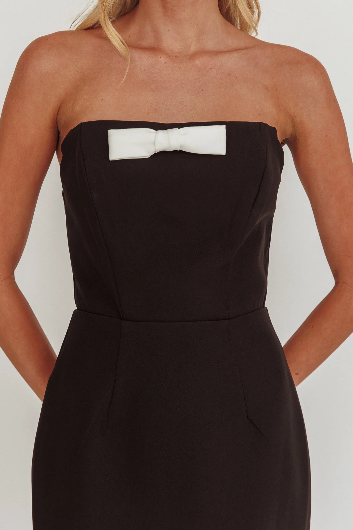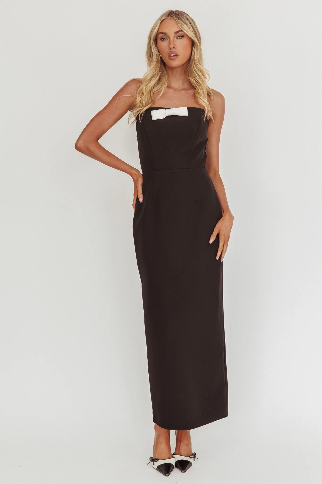 Make an entrance in our chic Cocktail Party maxi dress. It features a classic, strapless design and bow detail in the neckline. It's perfect for a birthday soiree or a special event. Team it with black heels and a clutch for a head-turning look.