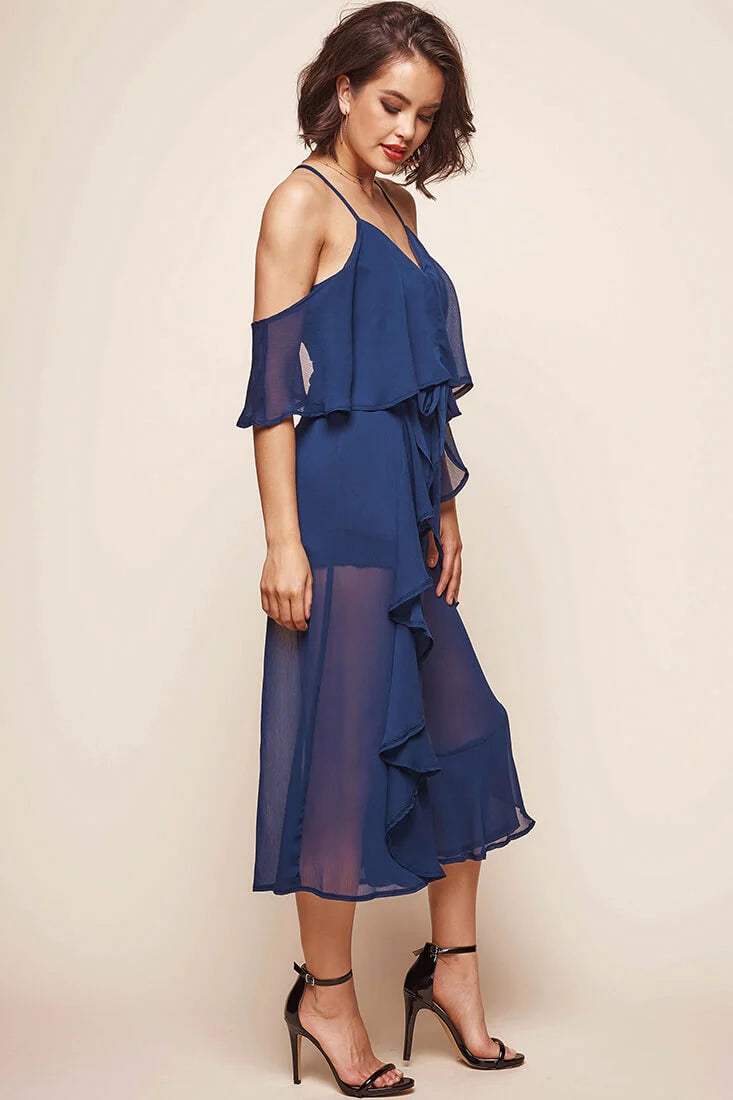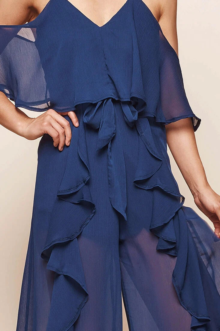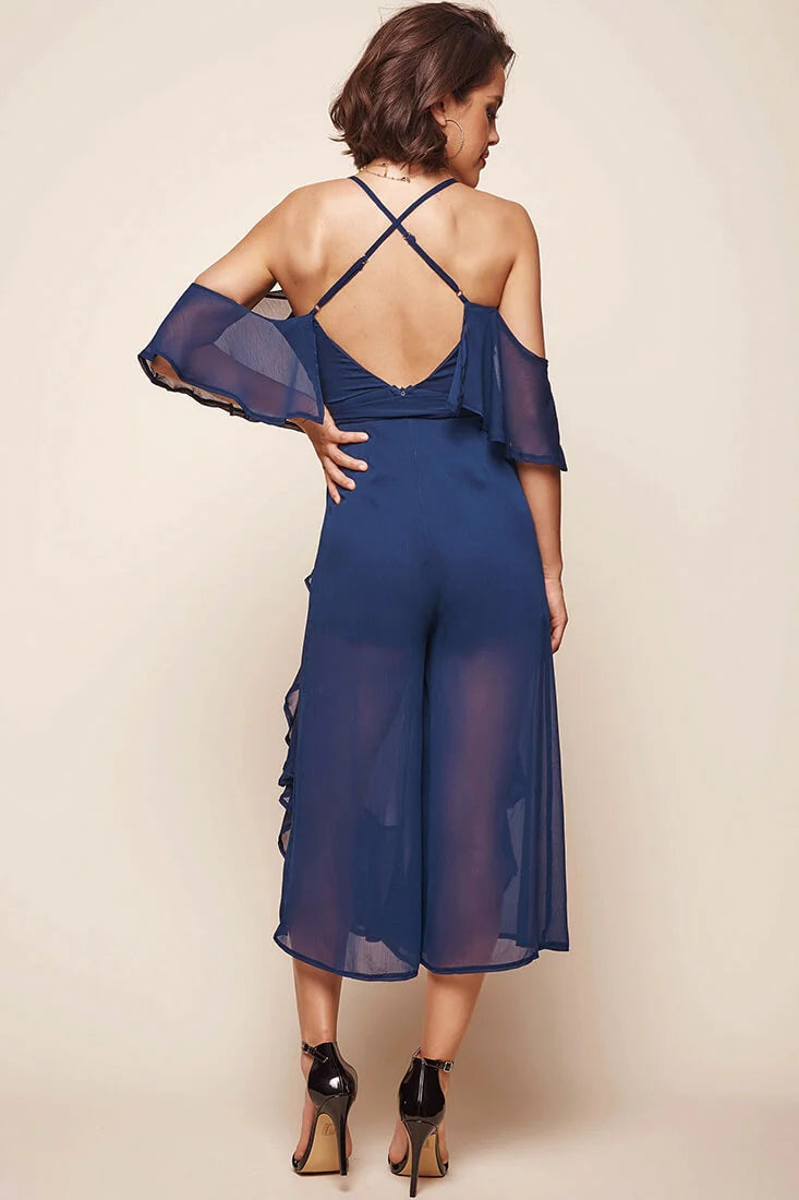 Floaty and feminine, this jumpsuit is perfect for a first date with that guy you've spent all week insta-stalking. It's classy, but just the right amount of sexy with it's sheer chiffon fabric. We love the back with its criss-cross-straps-to-sleeves that form a beautiful silhouette. Pair with a nude heel and smokey eye and get ready for a second date.