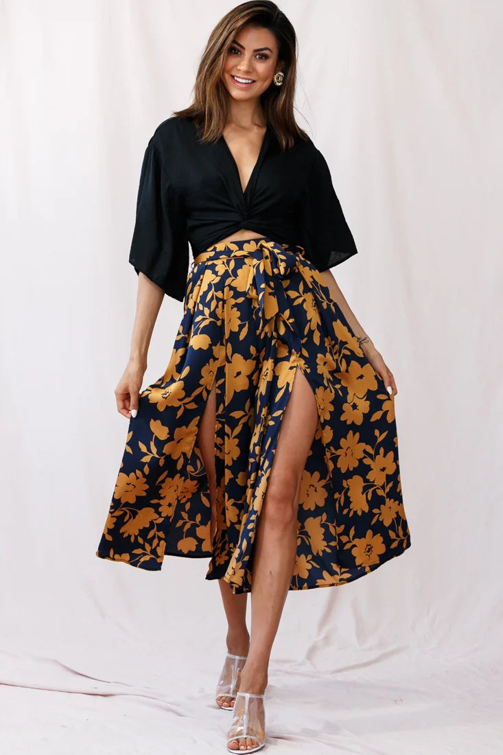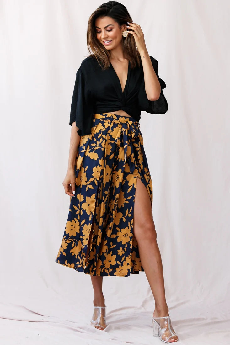 Pack your bags because these pants will have you wanting to go on a tropical vacay, stat. Featuring an on-trend midi length, breezy splits to show off your tanned pins, invisible zipper and a separate tie-up belt. We're in love with the pretty floral print fabric. Team them with your favorite crop-top and wedges or crochet bikini top, sandals and a pina colada and hit the beach in style!