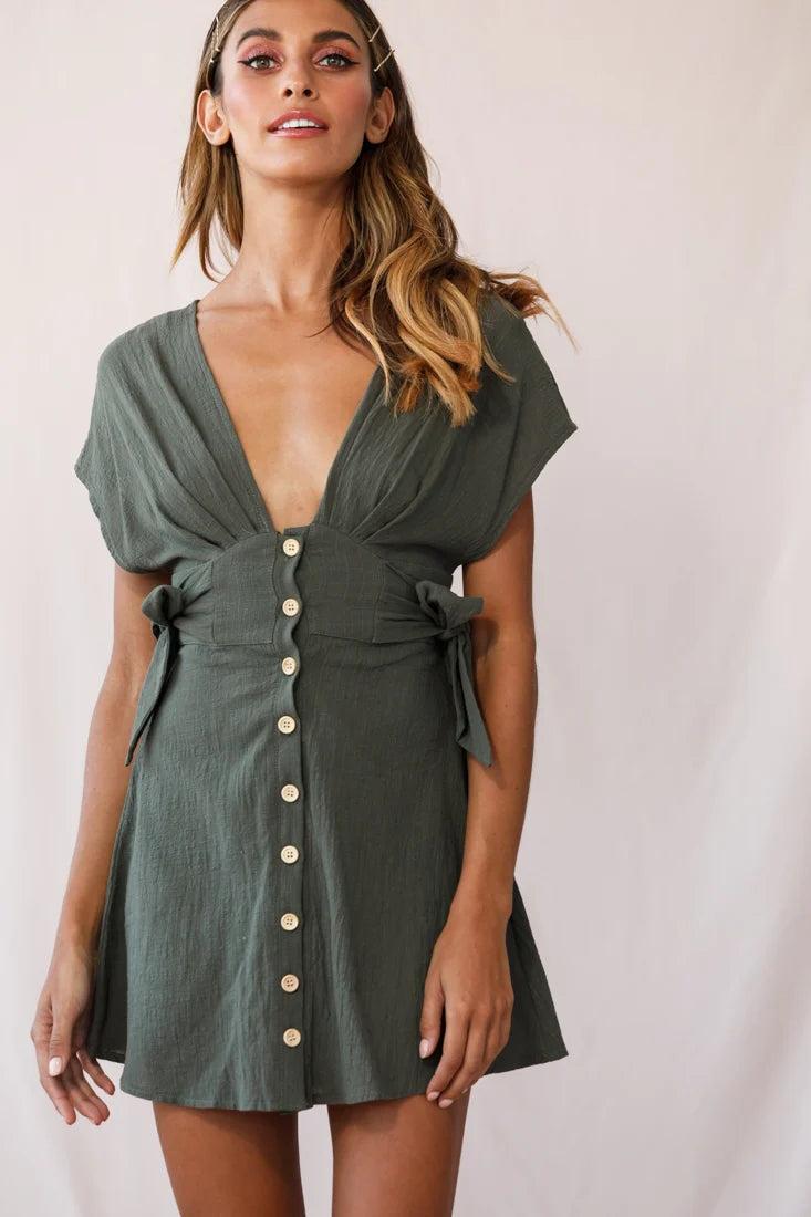 High waisted fitting low cut neckline buttoned dress from waist down with a side tie.