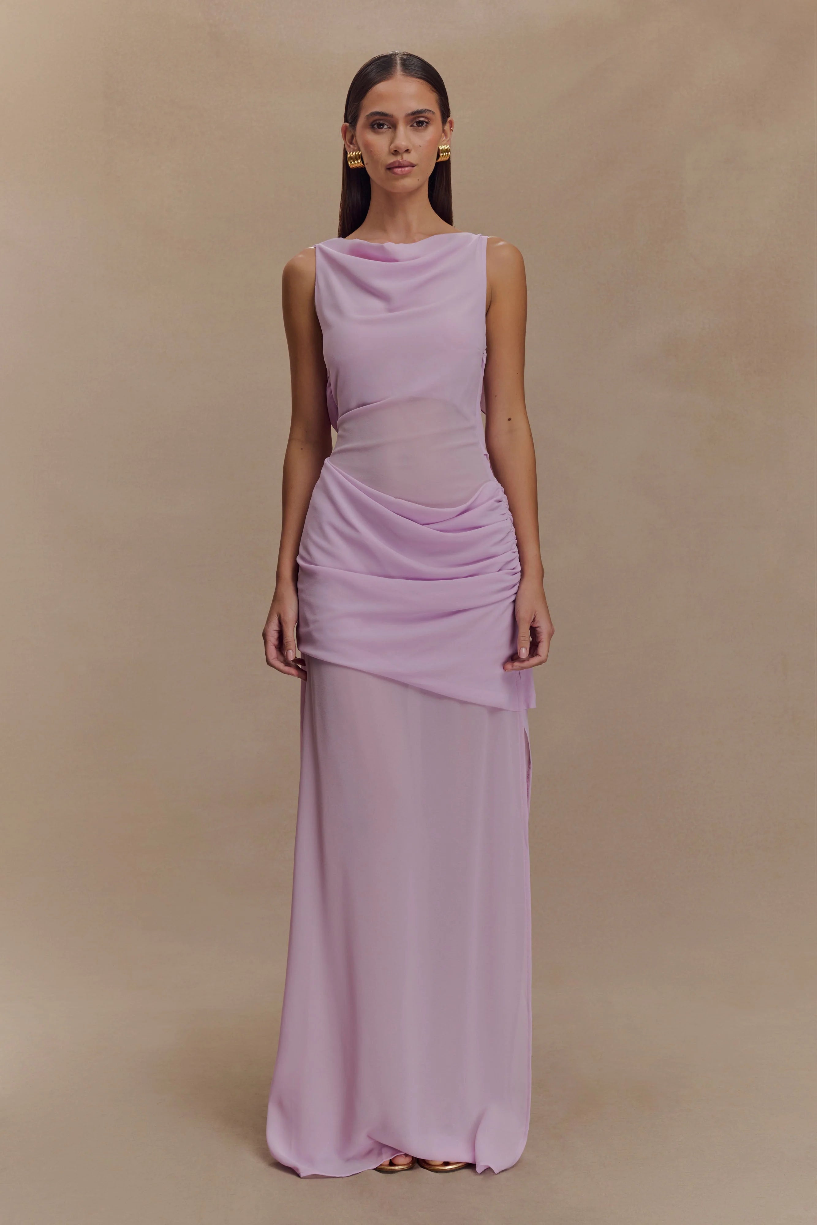 The DARIA Draped Chiffon Maxi Dress is a study in graceful movement and refined drama. Featuring a soft boat cowl neckline and a daring low back, this silhouette is elevated with a cascading drape from the back shoulder and layered chiffon overlays that float at the hip. Fully lined for a smooth fit and finished with an invisible side zip, this dress brings ethereal sophistication to any special occasion.