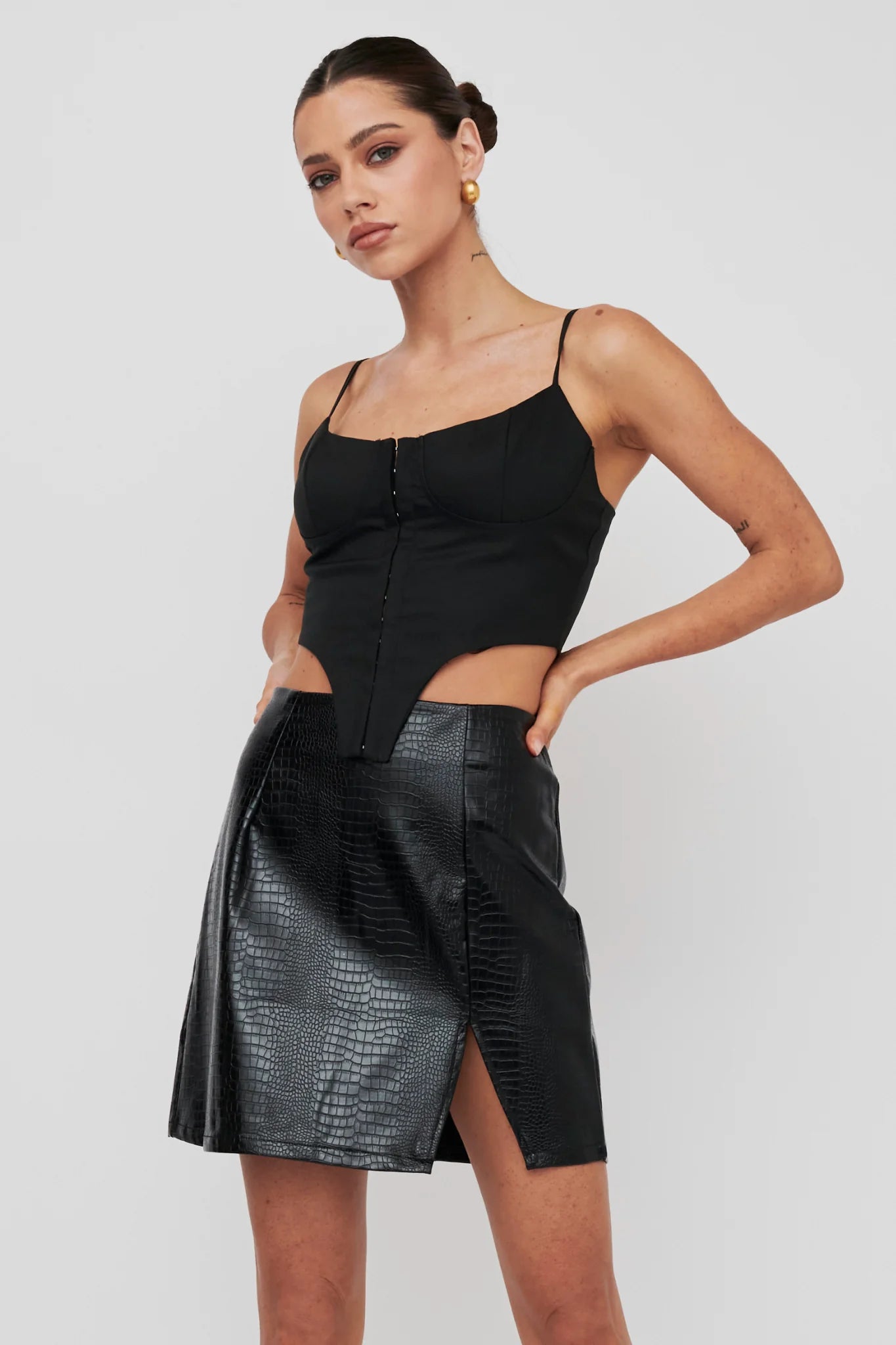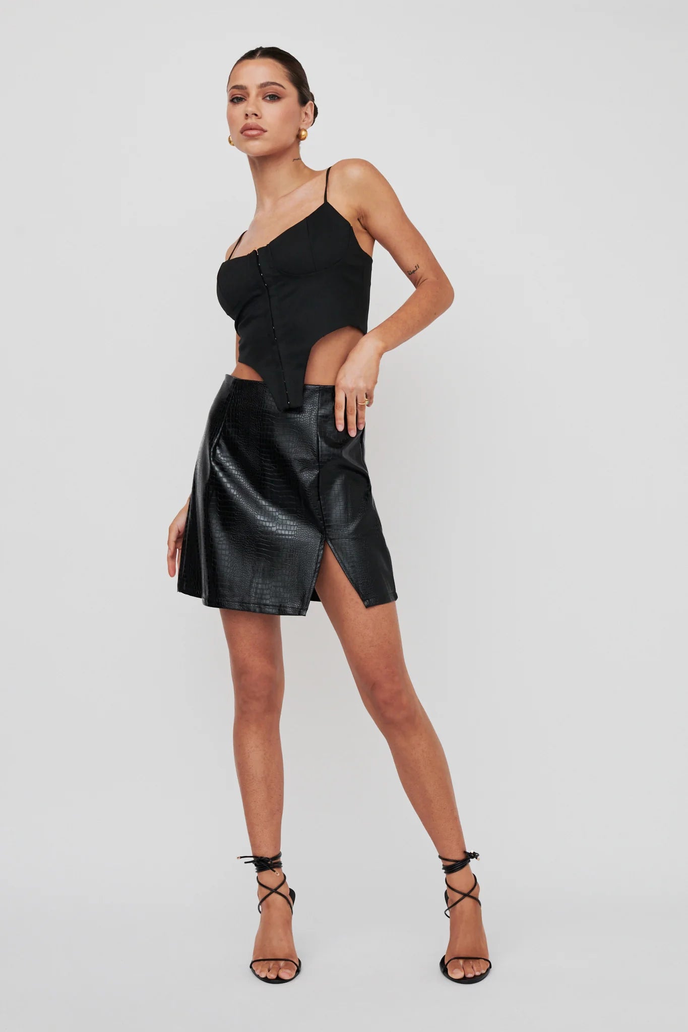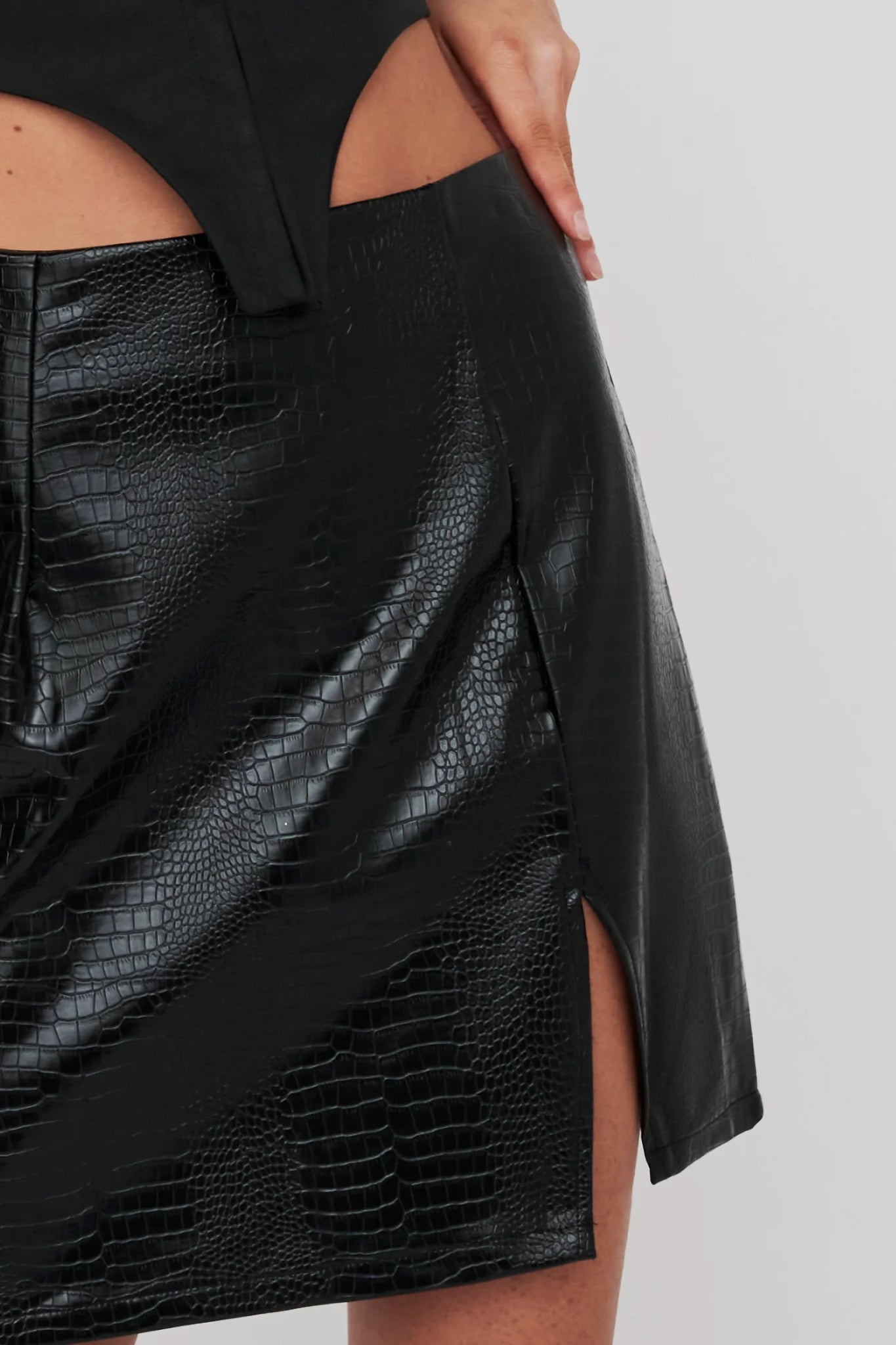Hello, gorgeous! We've fallen in love with our chic Darwin mini skirt. Featuring a snake-skin, embossed texture, it's perfect for a date night. Team it with a bodysuit and boots for an on-trend look we are loving.