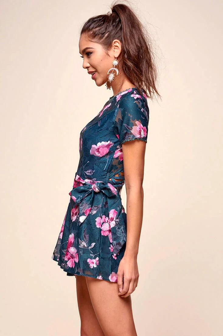 Rose petals bloom along this pretty romper while strappy back keeps the edge showing the perfect amount of skin. Wear with nude heels and a brown lip color.