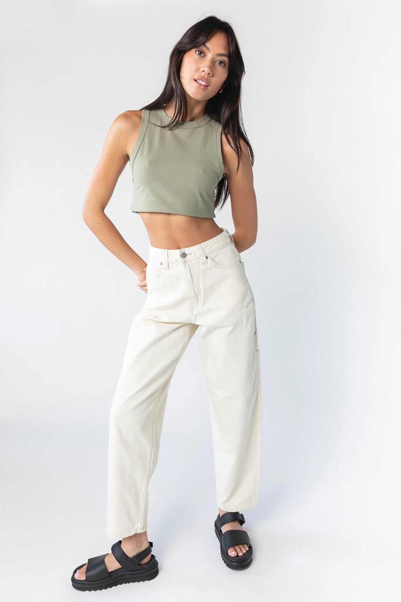 Bella is our chill girl. Designed to be snug at the waist/hips with a roomy fit on the legs. Slightly tapering down at the hem, the Bella Worker in Loom State can we worn long, rolled, or cut for a raw hem finish. Choose your true size for a relaxed fit, half size down (slim fit) or up (baggy fit).