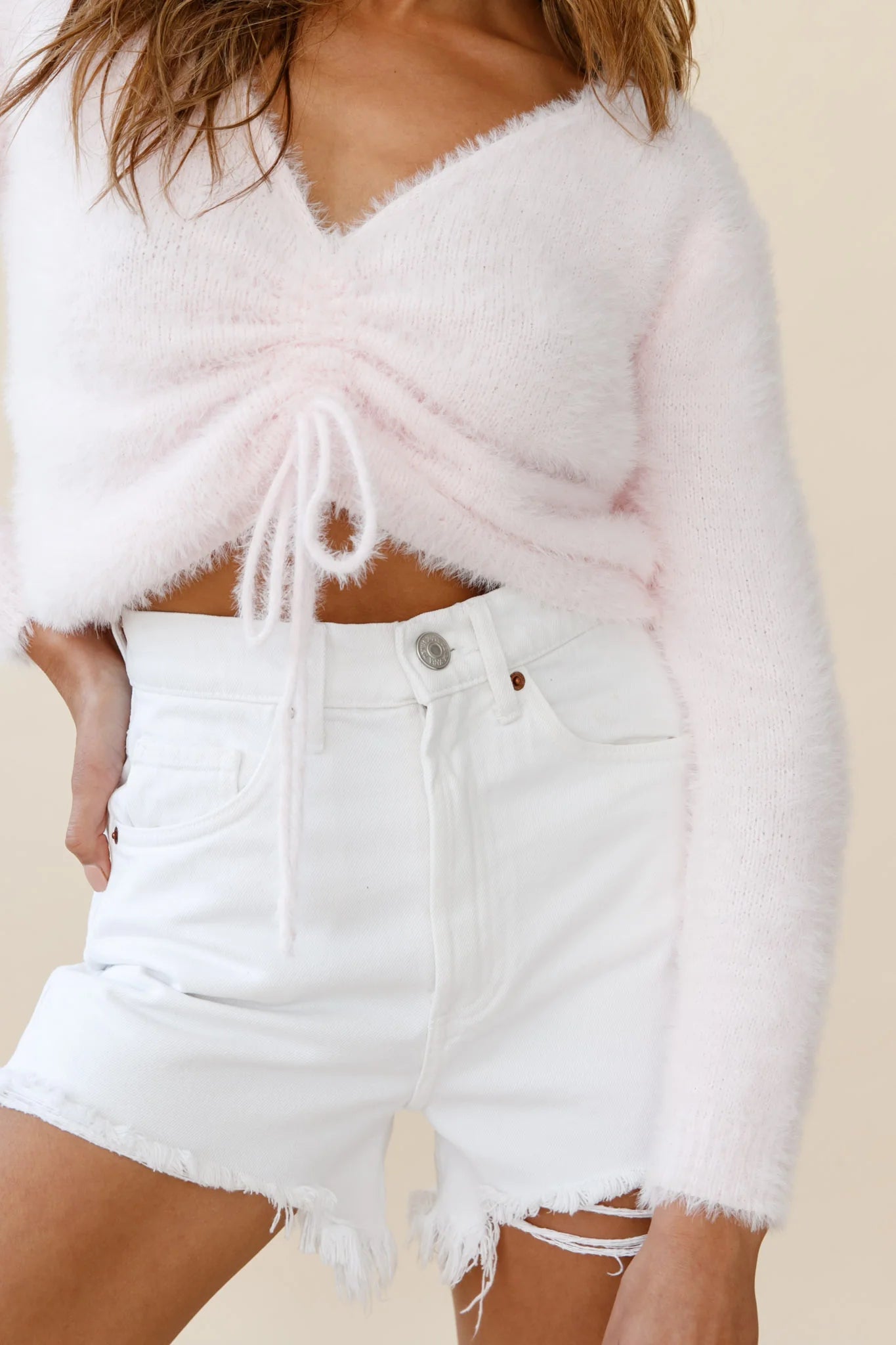 Hey there, cutie! We can't keep our hands off this adorable fuzzy sweater. It's so dreamy and soft and we love the ruching detail in the bust. Perfect for a girls' night out teamed with high waisted pants ans strappy heels. Super cute!