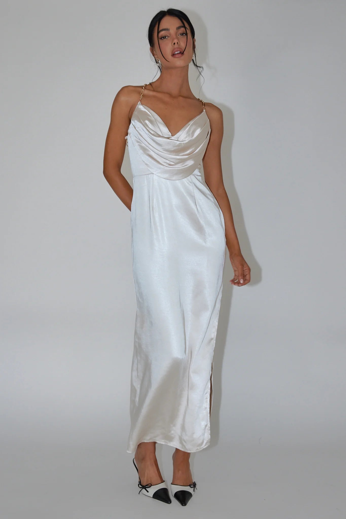 Your closet called, it needs this dress! Our Emanuella midi dress is perfect for a birthday celebration or special occasion. We are in love with its chic cowl neck and golden chain straps. Team it with perspex heels and a clutch for a super hot look that is sure to get you noticed.