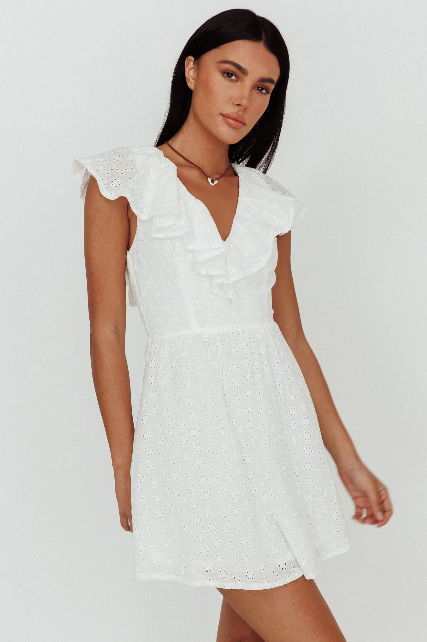 Float through your day in our gorgeous Kiarah mini dress. Featuring eyelet embroidery fabric and ruffle trim. It's perfect for Sunday Brunch with your girls. Team it with mules and a tote for an on-trend look we are living for.