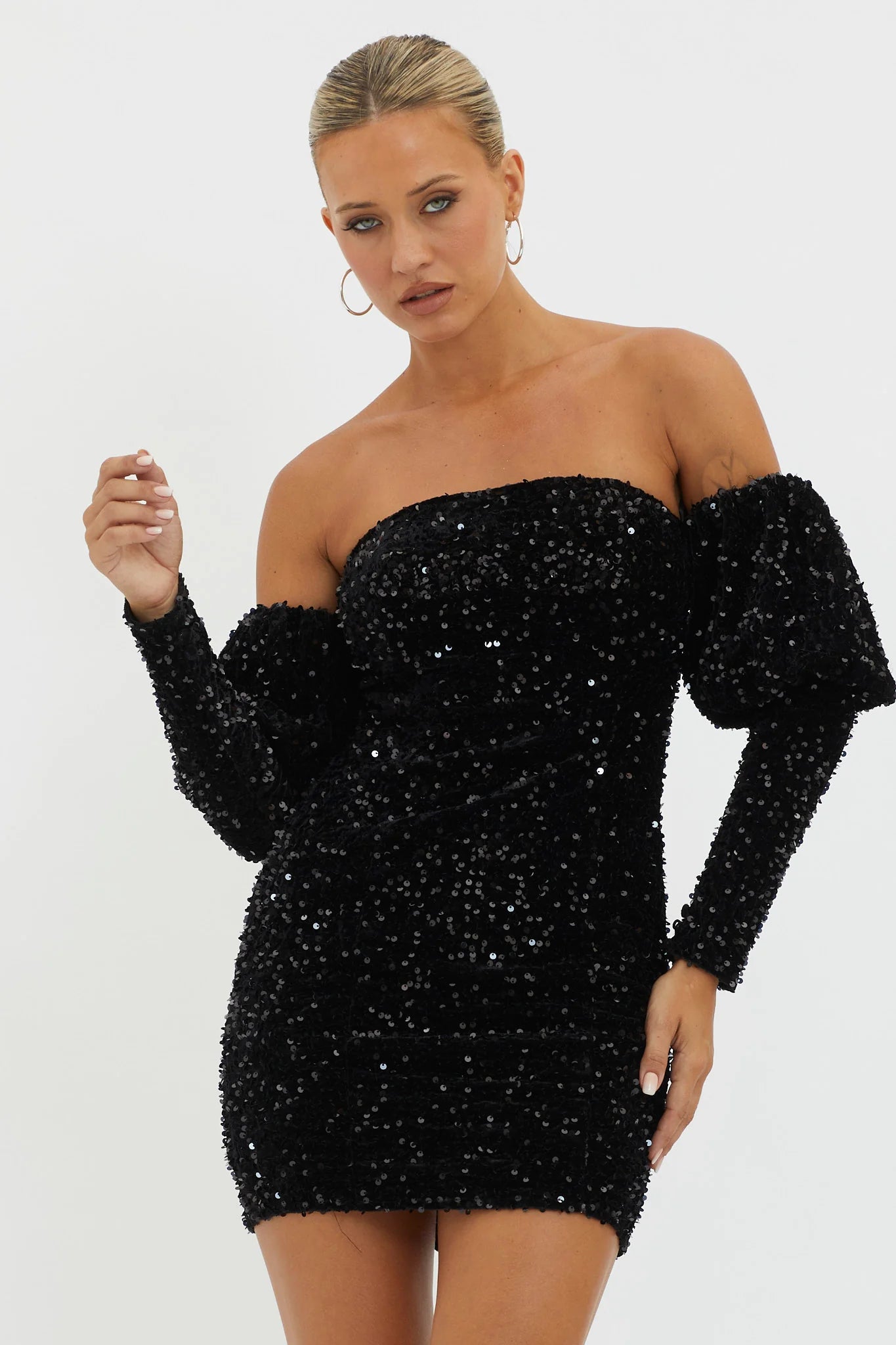 Make an entrance in our stunning Merry & Bright mini dress. Featuring a gorgeous sequin-embellished velvet fabric and off-shoulder style, it's perfect for a glam holiday party or special occasion. Team it with strappy, tie-up heels and a clutch for a jaw-dropping look.