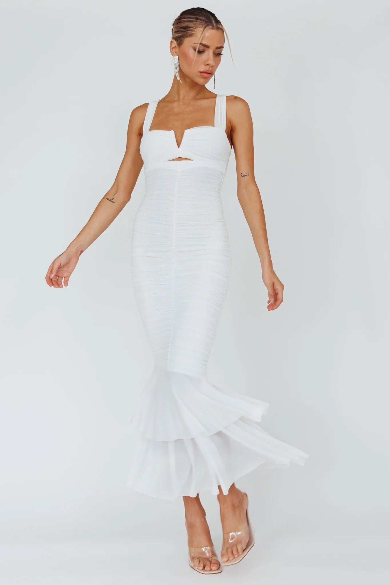 Make an entrance in our stunning Nadia maxi dress. Featuring a fishtail style and ruching throughout, we're in love! Perfect for the modern bride or prom! Team it with a clutch and nude heels for a look that will turn heads.