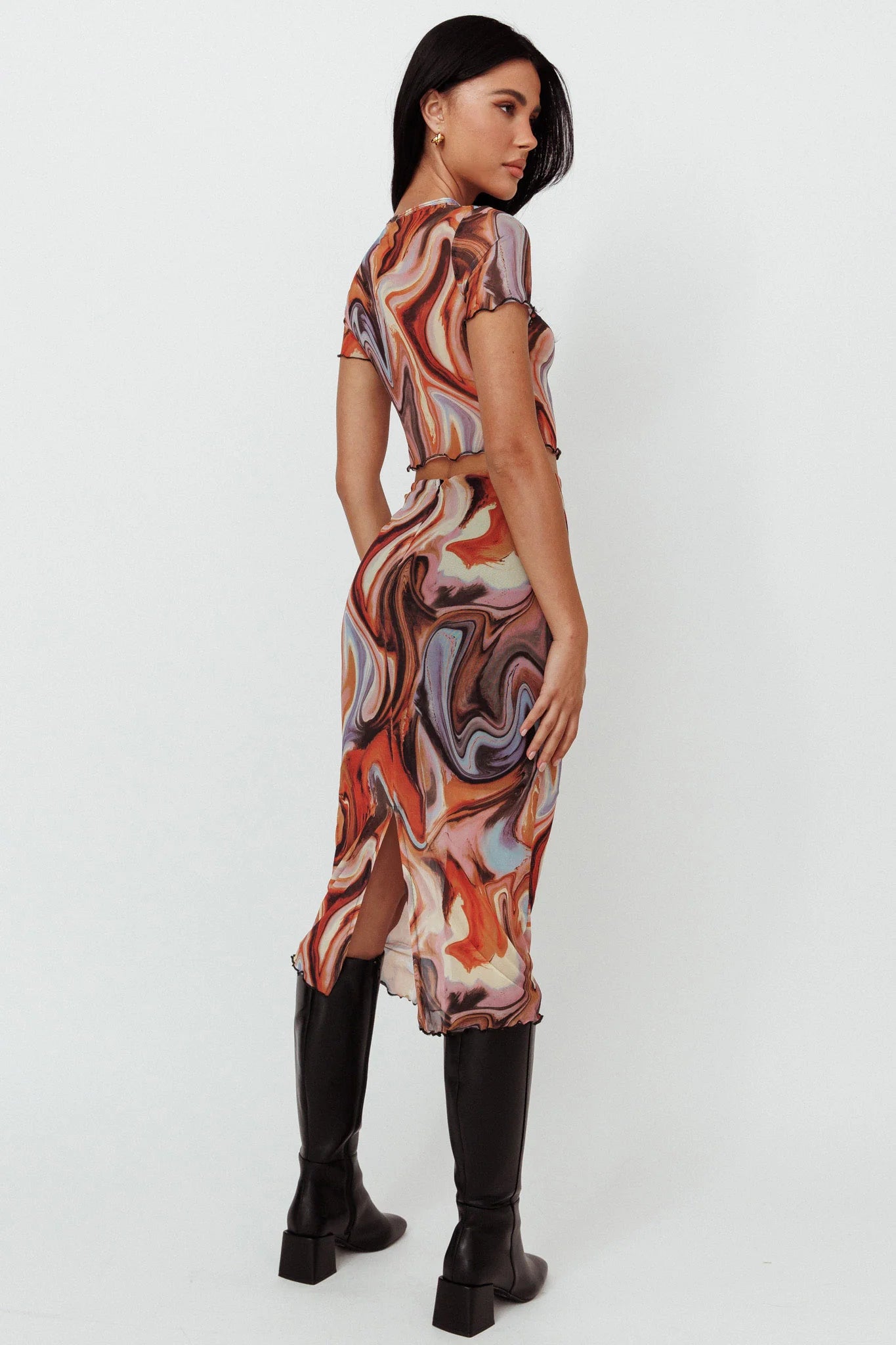Turn heads in our chic Priyanka midi dress. Featuring a pretty, printed mesh and lettuce edge hem. It's perfect for your 9 to 5 or date night with your love. Team it with the Northern Light crop top and boots for a look that will make them stop and stare.