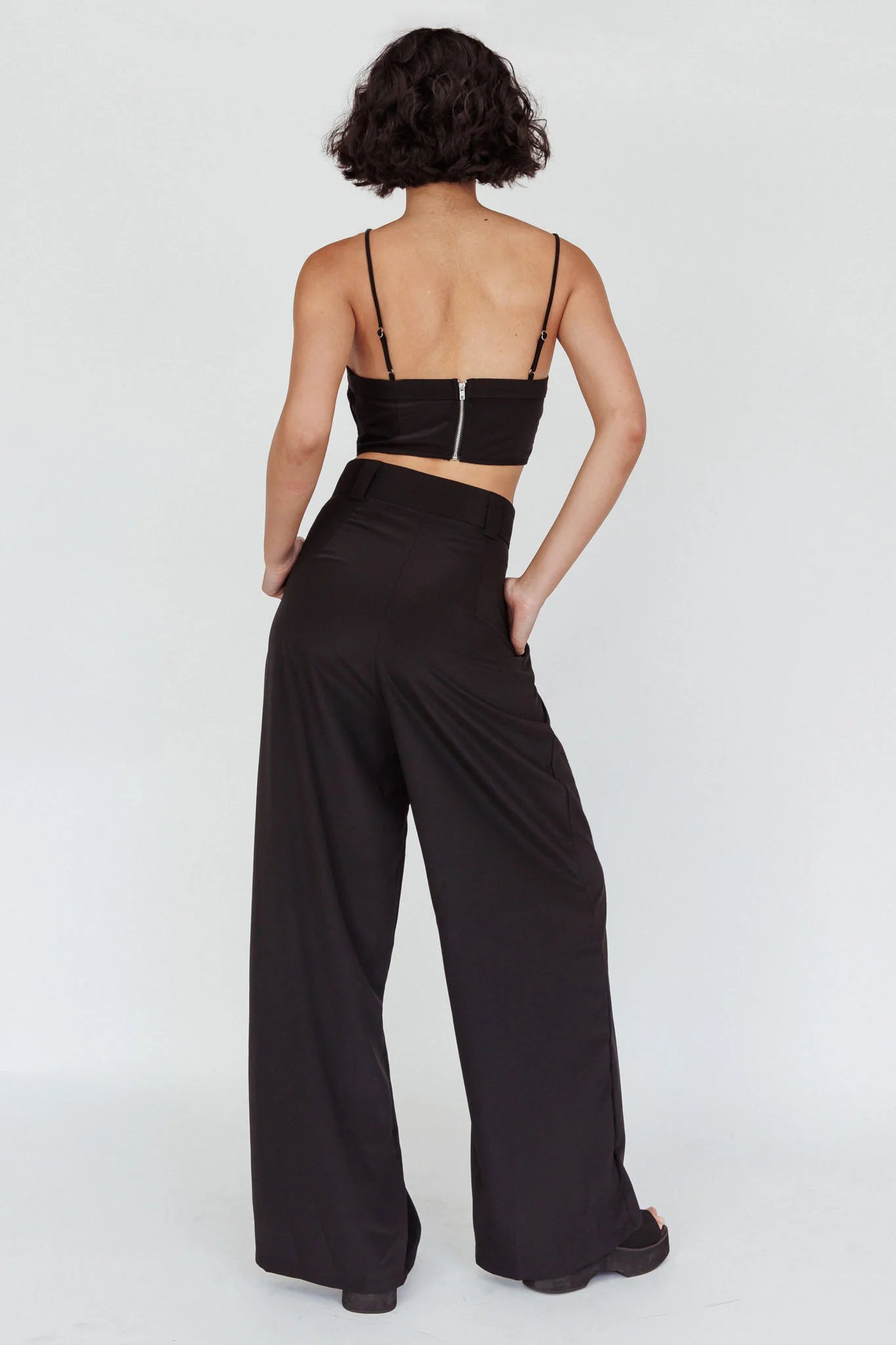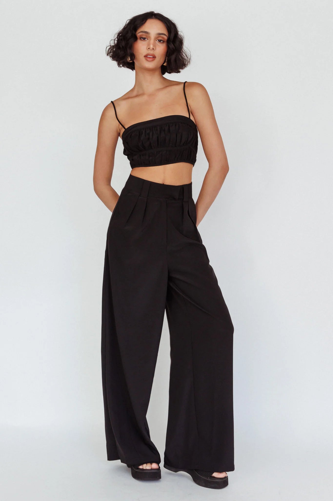 Steal the spotlight in our super cute Regal pants. We are obsessed with their on-trend wide-leg style. Perfect for a night out with the girls teamed with their matching crop top and tan mules.