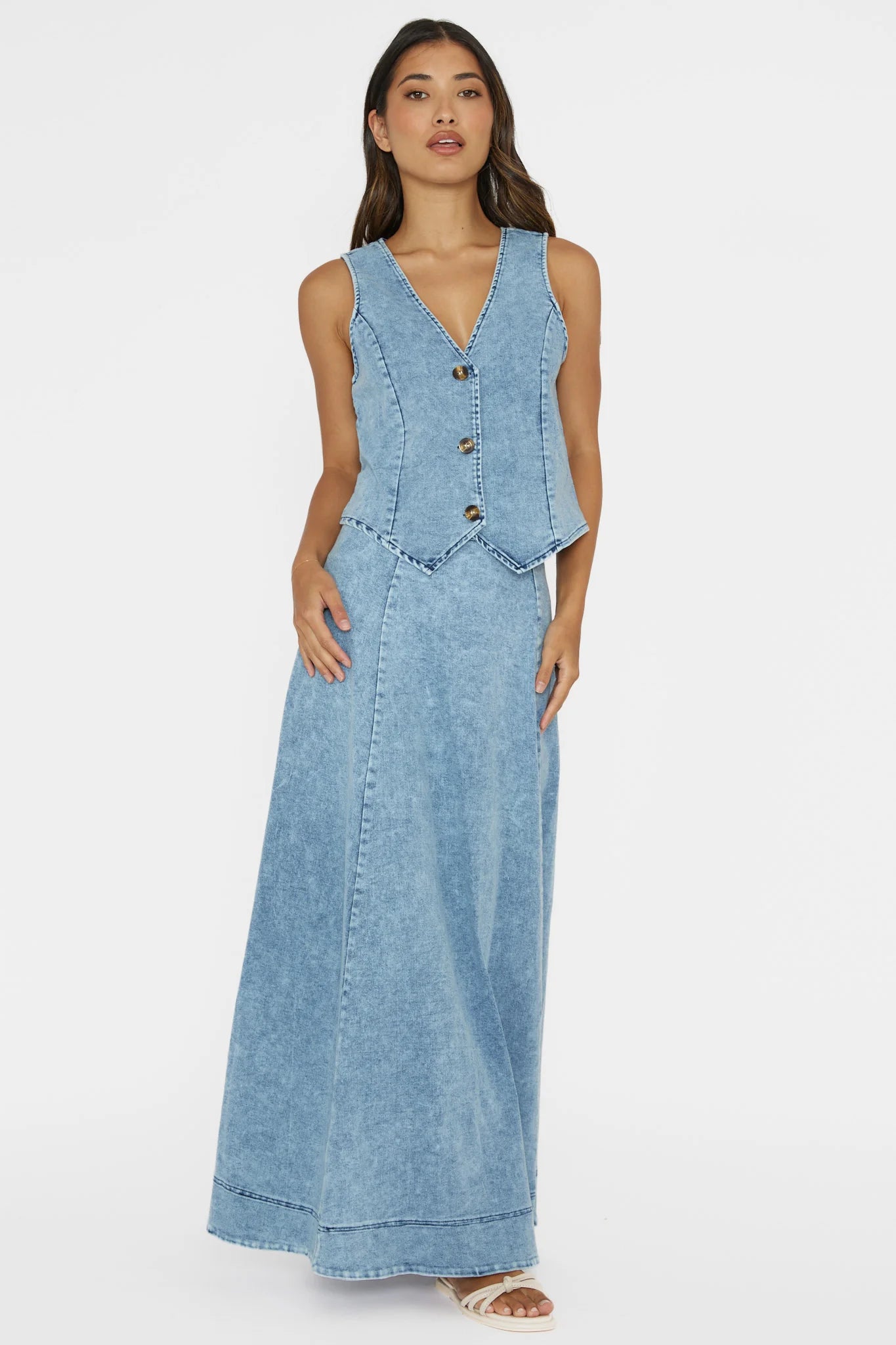 Channel your inner It Girl in our super trendy Rhythms skirt. It features a maxi length and a faded denim look. It's perfect for a weekend lunch date with your girls. Team it with its matching vest top and mules for a head-turning look.