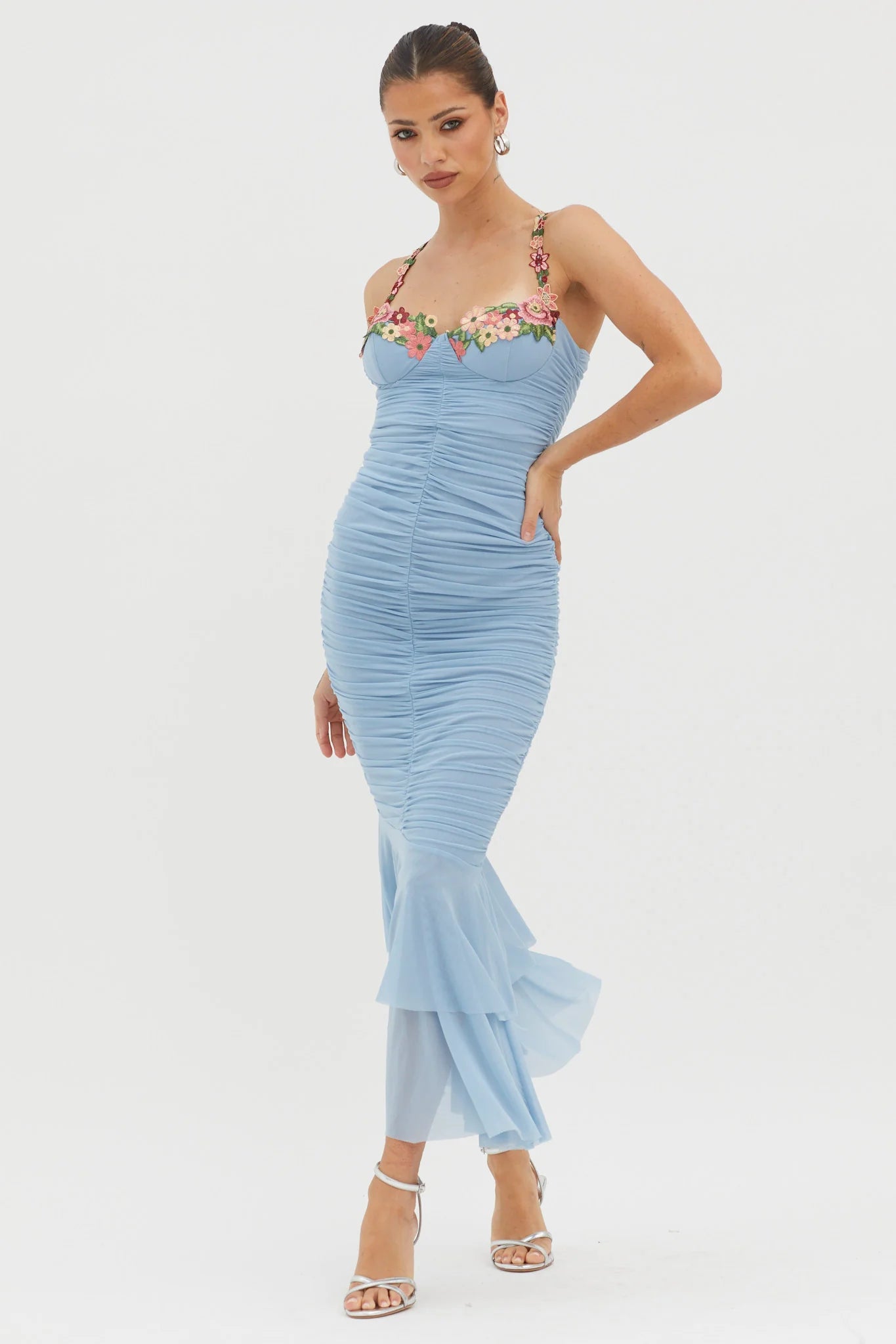 Heads will turn when you walk by in our gorgeous Rose Garden midi dress. We are in love with its pretty, floral applique trim and ruched mesh throughout! Perfect for a garden wedding or flirty date night teamed with strappy, nude heels and a clutch for a dreamy look we are loving.