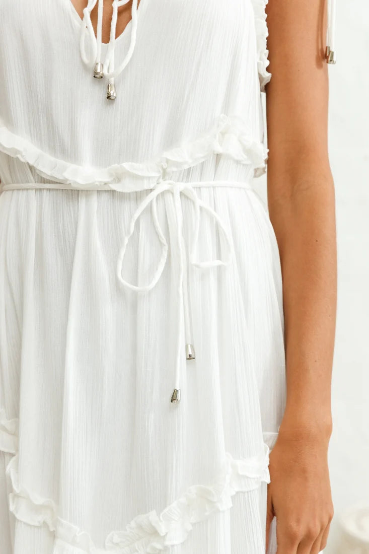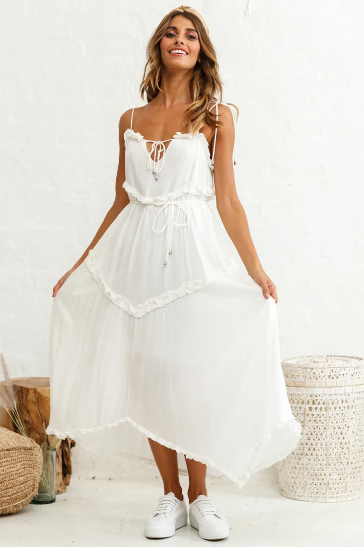 You'll feel like taking the day off work and escaping for a day of sun and fun in our Santa Monica maxi dress. Fully lined, it features double string-tie shoulder straps with golden toggles, frill details, a fluted hem and separate string tie around the waist. Team it with a straw hat and sandals for a fun look we are loving.