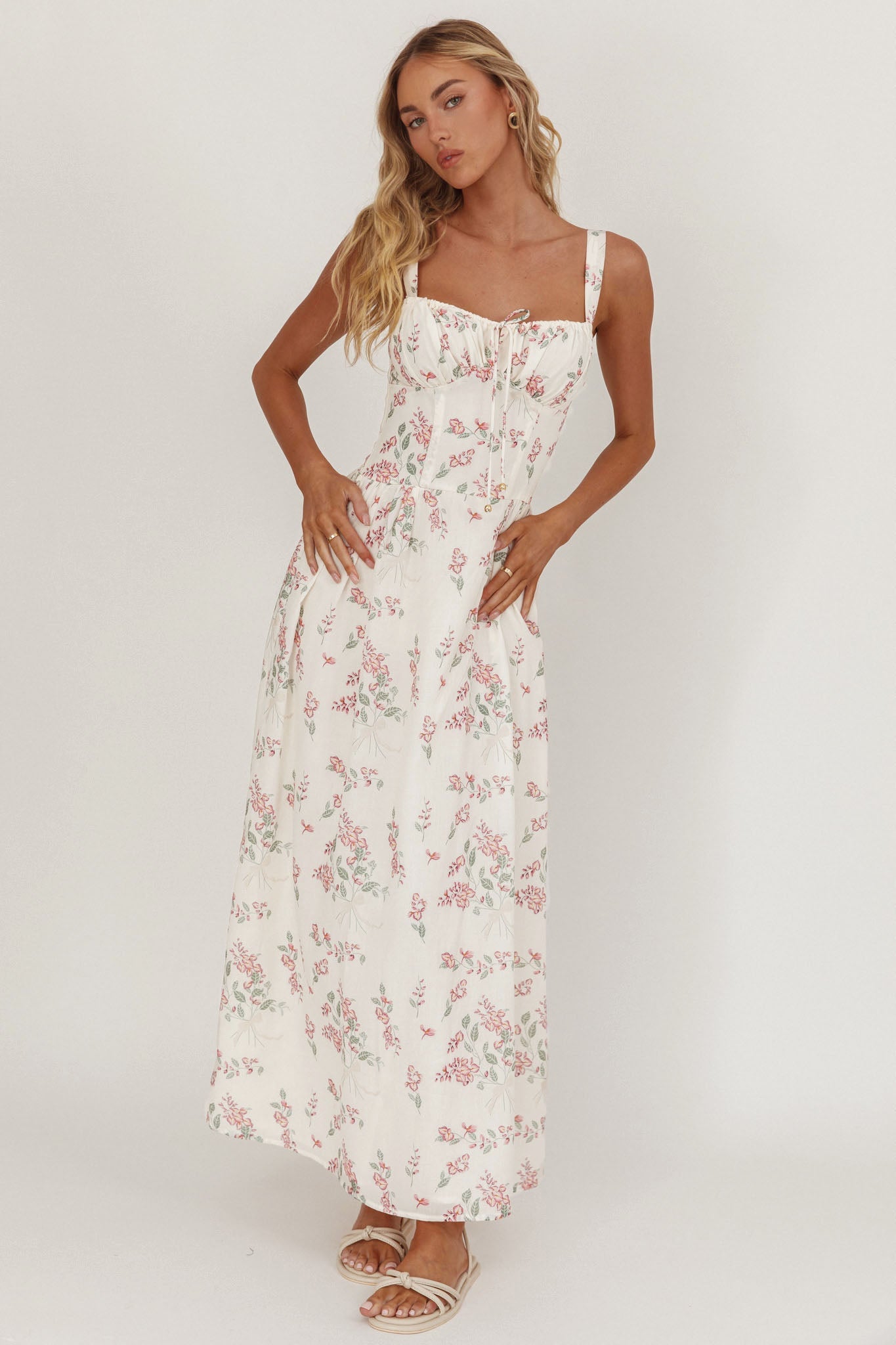 Make an entrance in our pretty Seen The Light maxi dress. It features a feminine floral print and tied bust and is just what you need for a flirty picnic date with your lover. Team it with kitten heels and a basket bag for a dreamy look.
