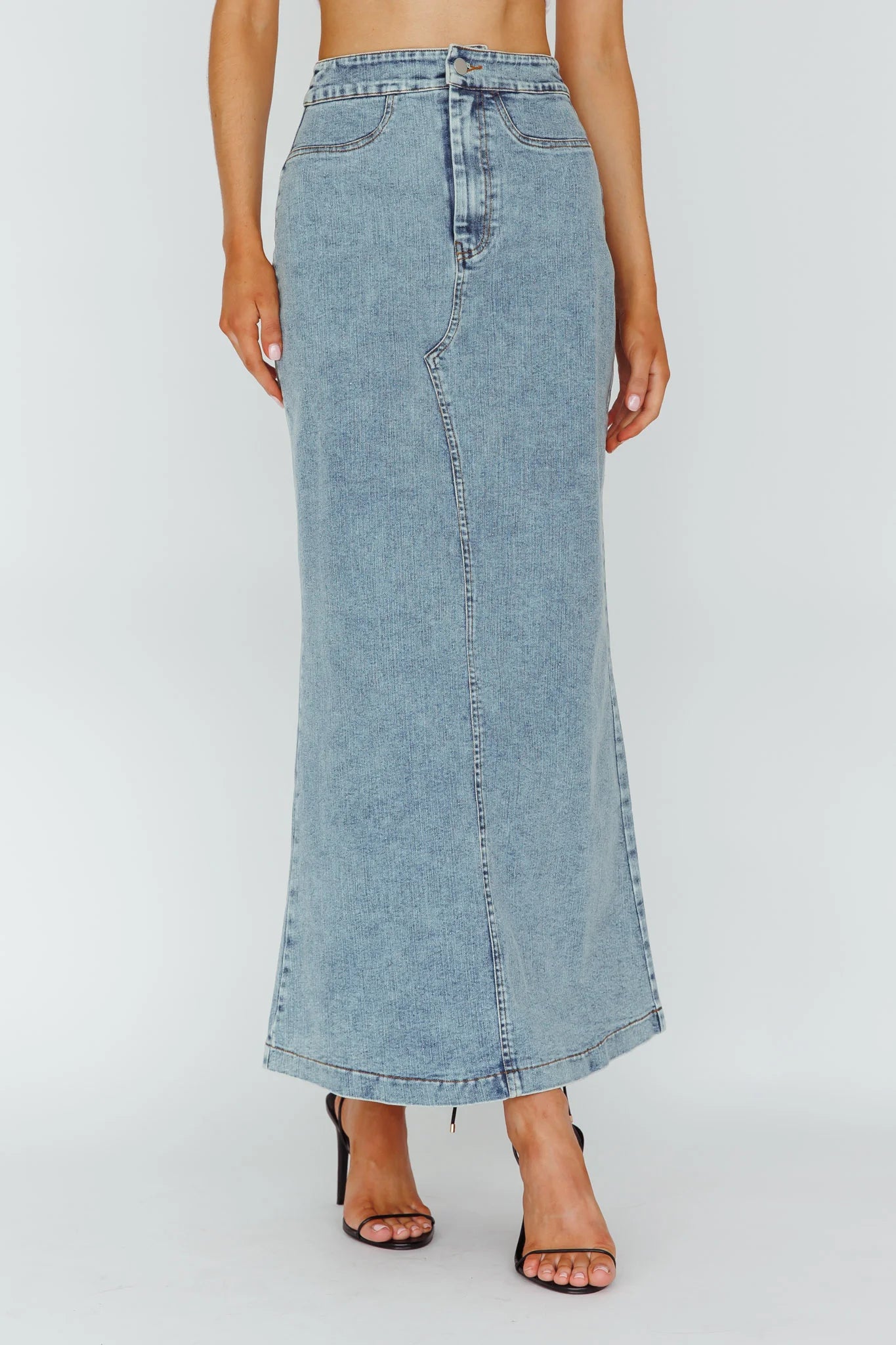 Make a statement in our on-trend Sinead skirt. Featuring a maxi length and denim fabric, it's this season's must-have look. Team it with a simple white crop top and mules for a look we are loving.