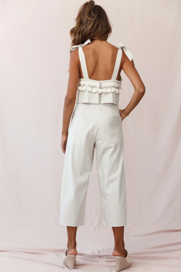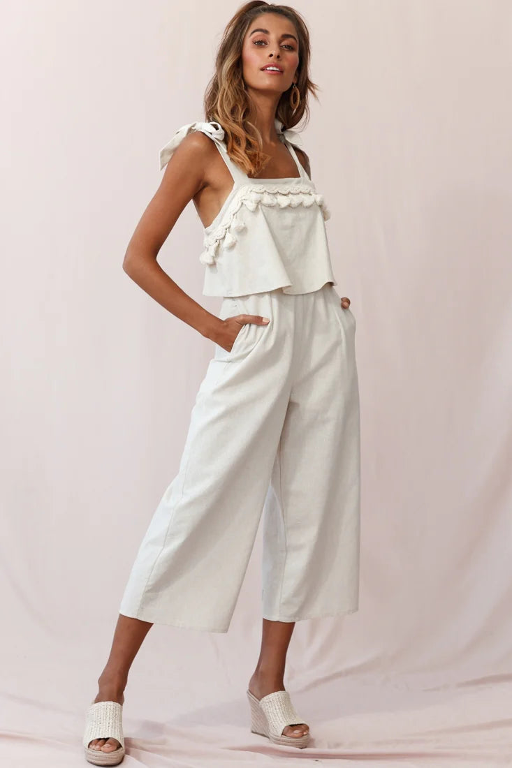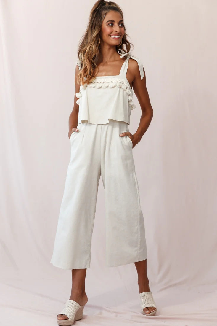 Perfect for your next warm weather vacay, our chic Sirocco jumpsuit features partial lining, tied shoulder straps, layered bust design, tassel trim embellishment and a wide-leg, midid length pant. Team it with some canvas wedges and a head scarf or throw on some sandals for a day at the beach. Dreamy!