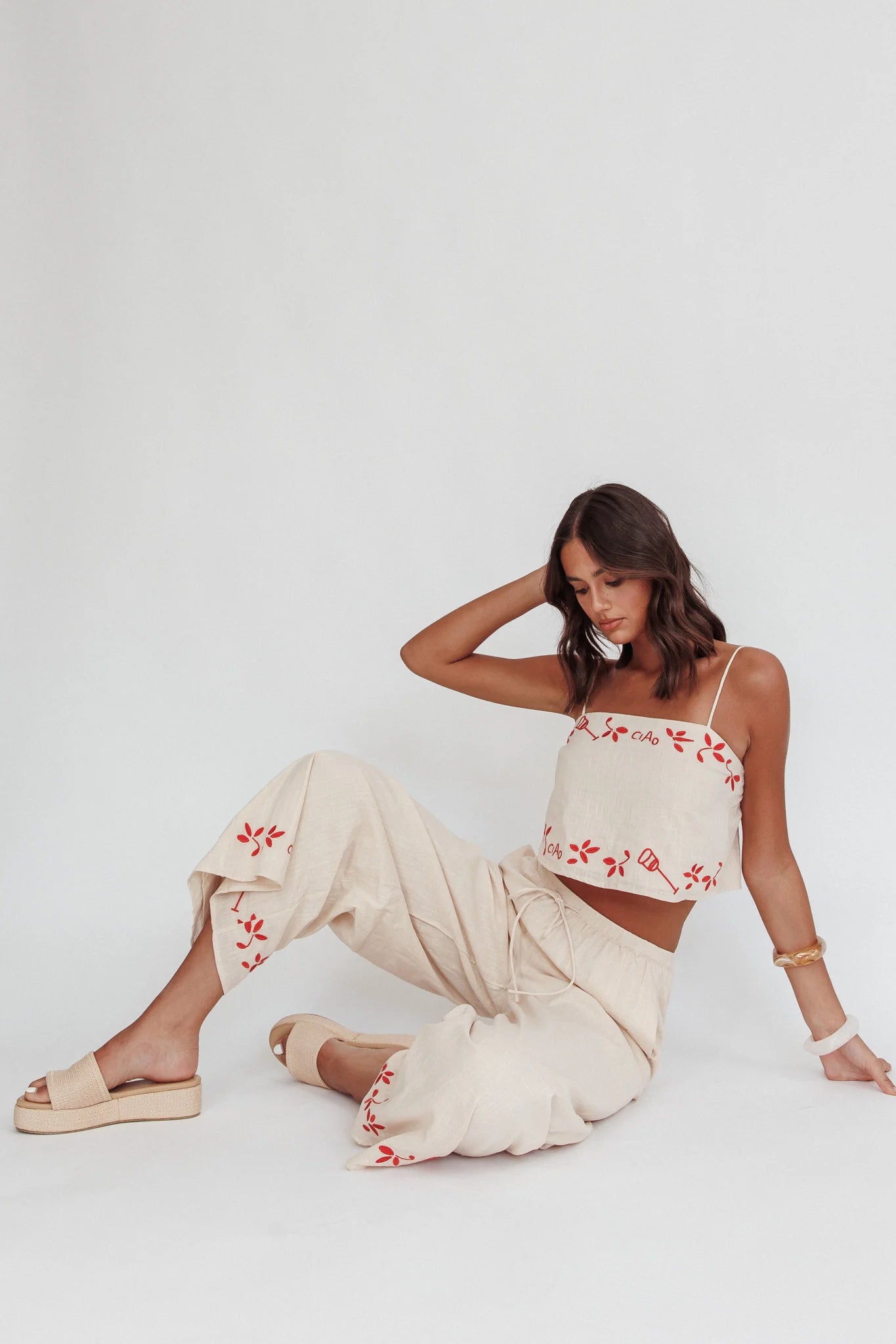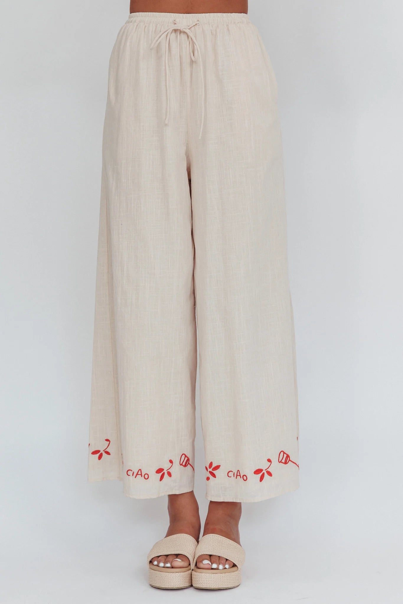Float through your weekend in our super cute Sorrento Summer pants. We are obsessed with their Italian-inspired embroidery detail and on-trend wide-leg cut. They're perfect for Sunny weekends strolling your fave vintage flea markets with your BFF. Team them with their matching top and slides for a look we are crushing on.