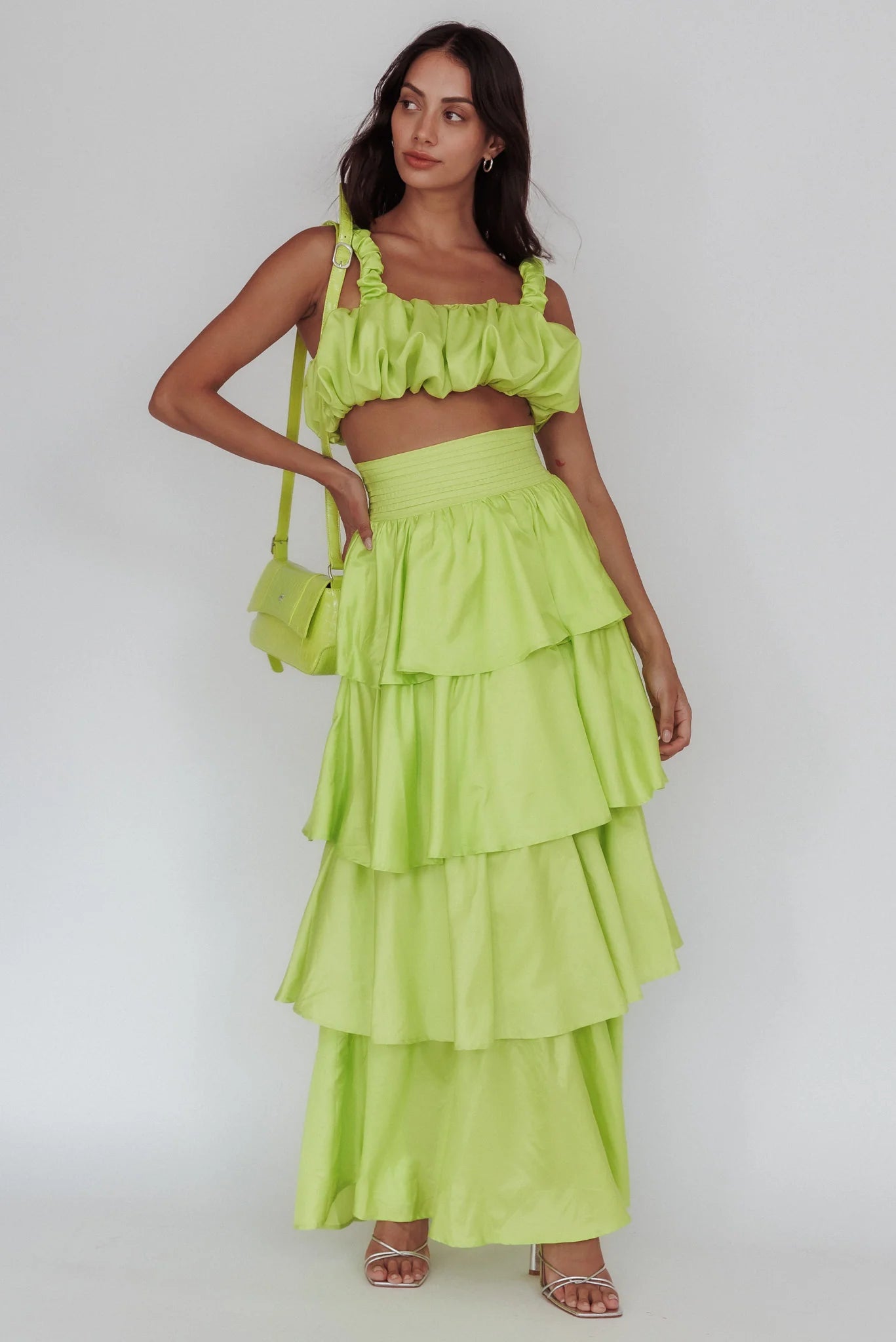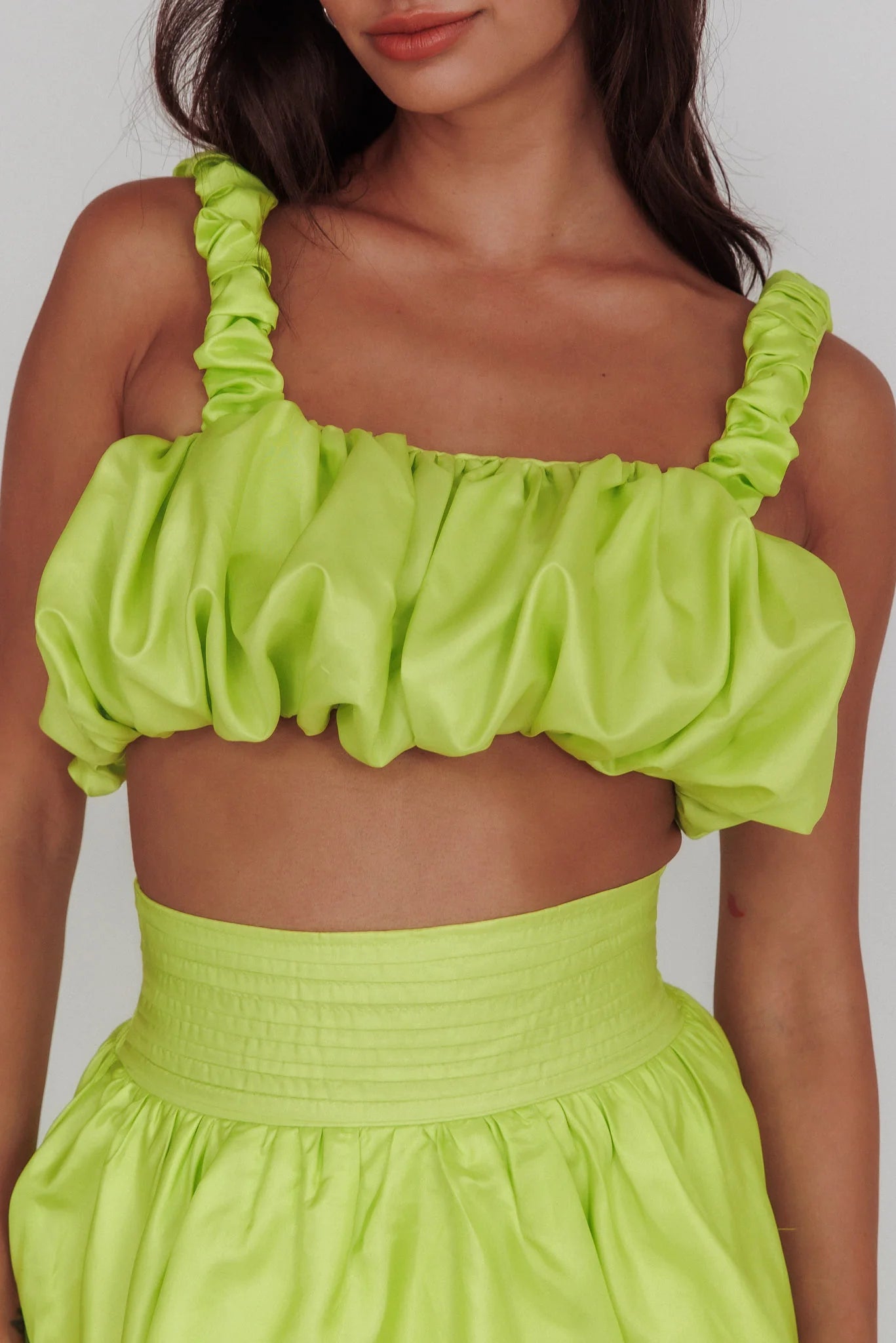Hello, cutie! You will set hearts aflutter in our gorgeous Sozo crop top. We are in love with its puffed, bubble style and on-trend lime hue. Perfect for a girls' night out teamed with its matching maxi skirt and bright heels.