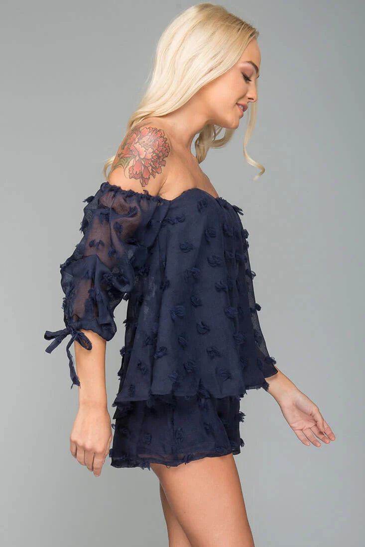 Threaded fringe detail bounce along this adorable off the shoulder romper with sheer sleeves and overlay. Pair with a statement necklace and sky high stilettos.