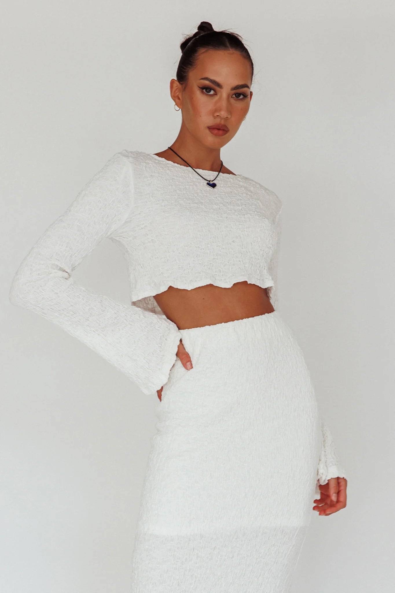 Channel your inner It Girl in our chic Treasures crop top. Featuring a textured fabric and flared cuffs. Perfect for a dinner date with your girls! Team it with its matching skirt, mules and a tote for a look that will turn heads.