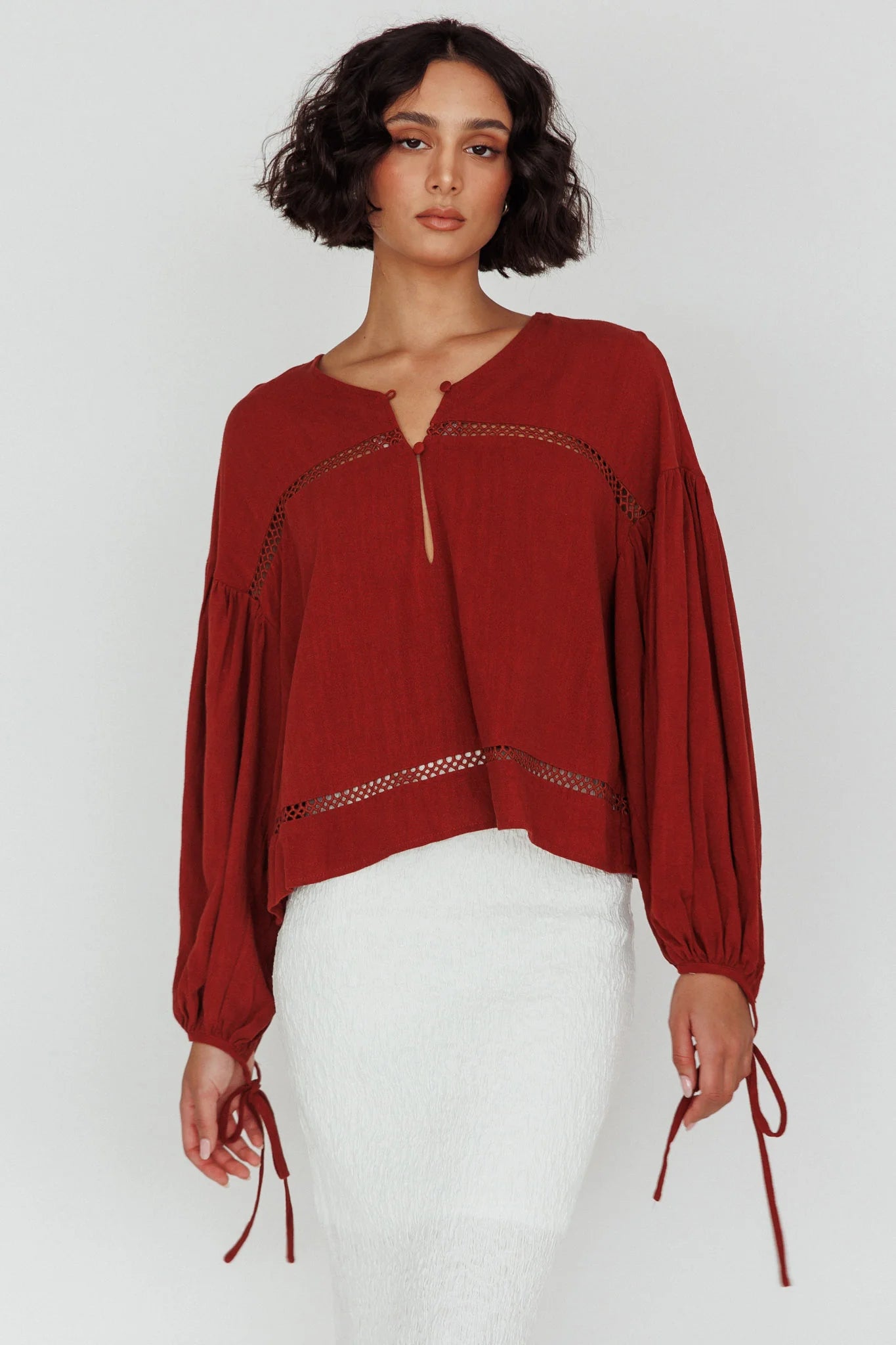 We are in love with our pretty Waltz top. Featuring embroidery trim detail and long, balloon sleeves. It's perfect for weekend mall dates with your girls. Team it with denim shorts and boots for a chic look.